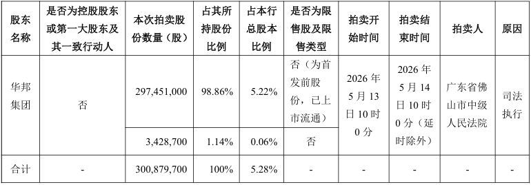 4月16日,兰州银行发布公告称,该行收到《广东省佛山市中级人民法院网络拍卖事项告知书》(2026)粤06执275号),该行股东华邦控股集团有限公司(以下简称“华邦集团”)持有的3.01亿股兰州银行股份将于2026年5月13日10时0分起至2026年5月14日10时0分止(延时除外)在广东省佛山市中级人民法院京东网司法拍卖(变卖)网络平台上进行公开拍卖。